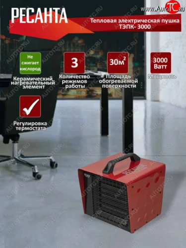 Наименование | Пушка тепловая 3.0кВт 250куб.мч керамическая электрическая РЕСАНТА РЕСАНТА тэпк-3000 с доставкой в г. Кемерово |